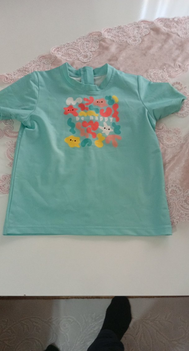 Yumuşak ve sıcak kumaştan üretilmiş, turkuaz renkli, kısa kollu ve yuvarlak yaka kız çocuk tişörtü. Ön kısmında renkli baskılar bulunur.