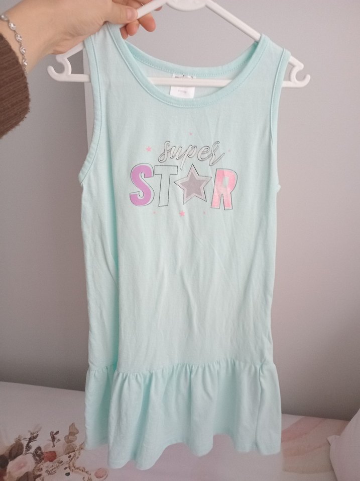 Kolsuz, turkuaz renkli, bol kesim kız çocuk elbisesi. Etek kısmında fırfır detay ve önünde "super STAR" renkli baskı bulunur. Yumuşak sentetik kumaştan üretilmiştir.