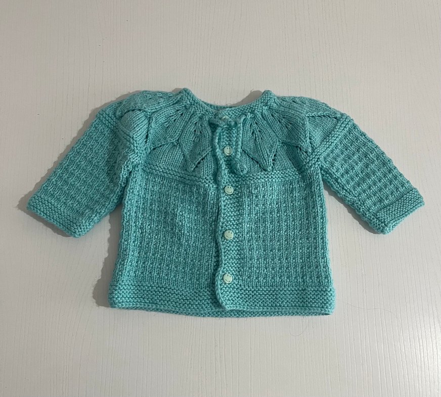 Turkuaz renkli, uzun kollu, örgü dokulu vintage tarzı kız hırkası. Fitted kesim ve desensiz tasarım içerir.