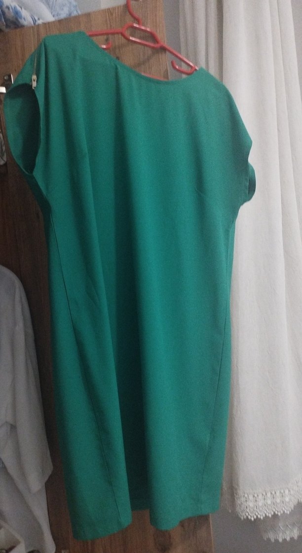 Turkuaz renkte, kolsuz, midi boyda, dökümlü ve bol kesim kadın elbisesi. Düz, parlak yapıda sentetik kumaştan üretilmiştir. Günlük kullanıma uygundur.
