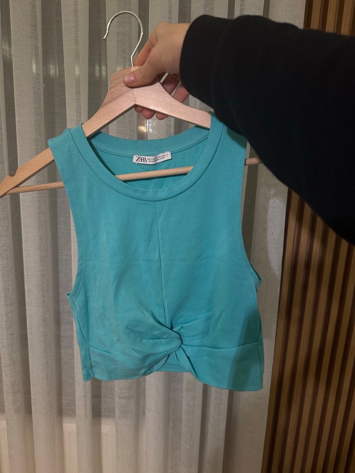 Turkuaz renkte, kolsuz ve kısa kesim keten bluz. İnce kesimi ve yuvarlak yaka detayıyla günlük kullanıma uygun, sade ve şık bir tasarım sunar.