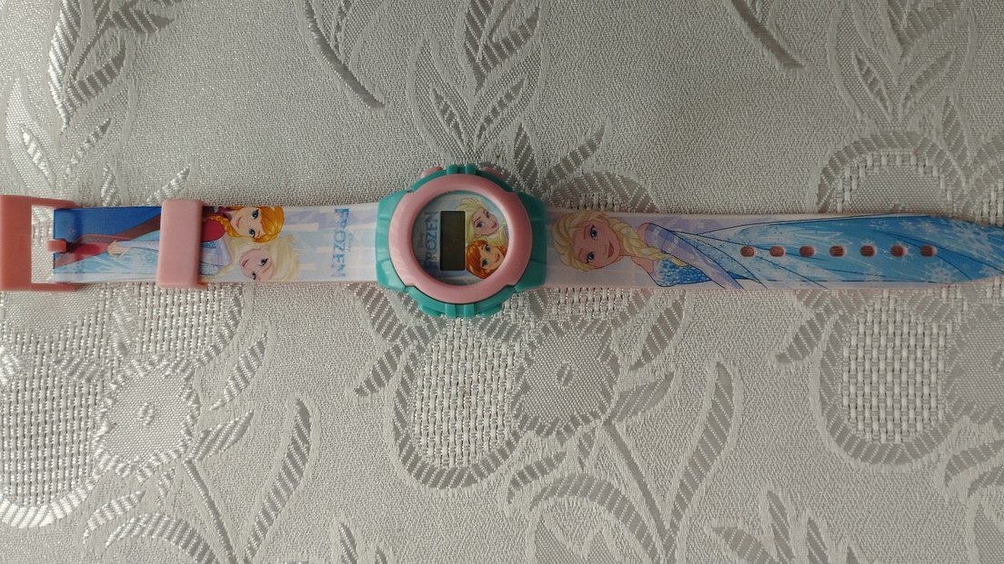 turkuaz renkli ve pembe kayışlı Frozen dijital saat kız çocuk, rahat kullanım sunar.