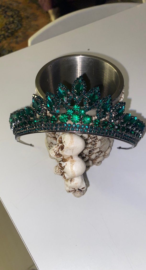 Bu avant-garde gotik saç aksesuarı, koyu turkuaz cam payetlerle süslenmiş çarpıcı bir taç tasarımına sahiptir. Ürün bir kez kardeşlerimin sünnet düğününde taktı Birdaha kullanılmadı sıfır ayarında hiç sorunu yok bütün taşları yerinde