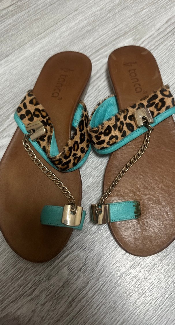 Turkuaz Leopar Desenli Zincirli Kadın Sandalet