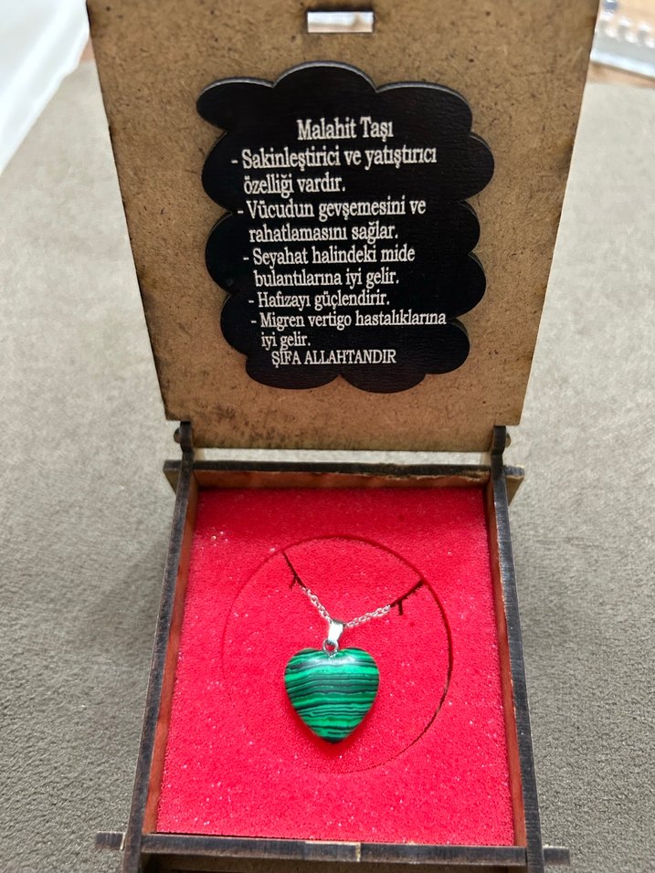Bohem tarzda, zincirli ve turkuaz malahit taşlı kolye. Rahatlatıcı etkisi ve seyahat bulantılarına iyi gelmesiyle bilinir. Romantik akşamlar için uygun, sade bir tasarım.