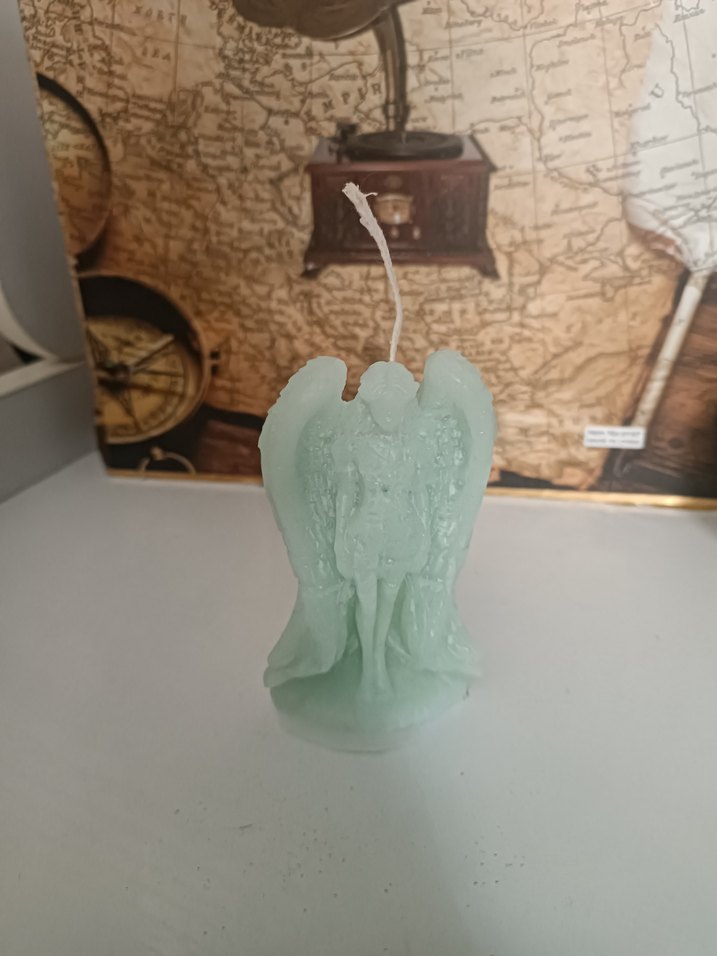 Açık turkuaz renkte, kanatları detaylı ve ayakta duran melek figürlü mum. Dekoratif kullanım için uygundur. ️