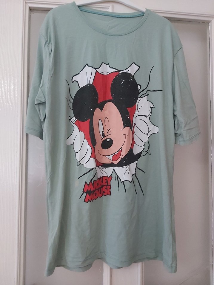 Turkuaz renkte, pamuk kumaştan, kısa kollu ve bol kesim tişörtü. Mickey Mouse baskısı ve düğmeli detaylarla parti havası verir.