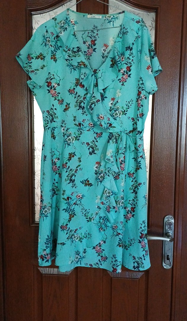 Turkuaz midi boy, bol kesim elbise, kısa kollu ve V yakalıdır. Baskılı desen ve fırfır detaylarına sahip yumuşak sentetik kumaftan yapılmıştır. Bohem tarzını yansıtır.