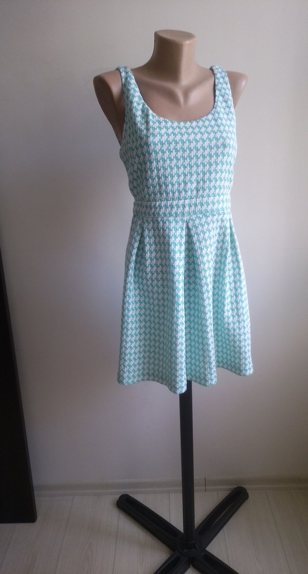 Turkuaz renkte, pilili ve fitted kesim elbisesi. Kolsuz, yuvarlak yaka, yumuşak sentetik kumaştan, günlük kullanıma Stardrevus marka 30 beden boy 83 cm kol altı 40 cm
