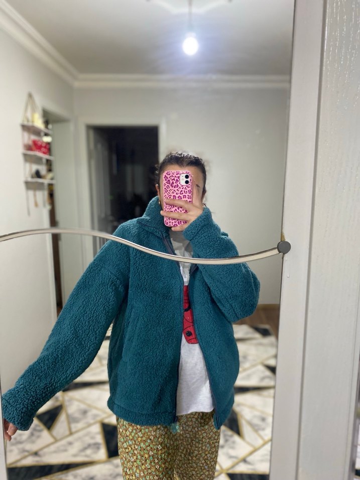 Turkuaz renkli, yüksek yakalı ve uzun kollu kadın kışlık ceket. Rahat kesimi ve yumuşak, sıcak örme kumaşıyla günlük kullanıma uygundur. ❄️ bir defa kullanıldı baya sıcak tutuyor