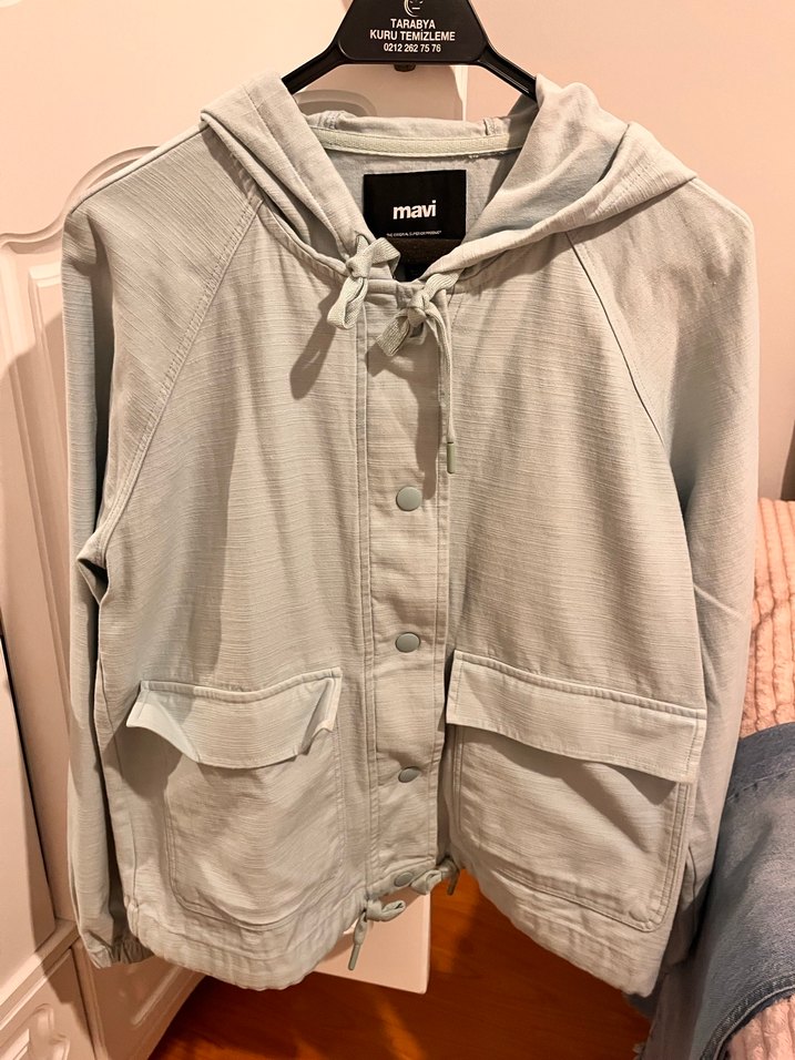 Turkuaz renkte, düğmeli, pamuk kumaştan midi boy, bol kesim kadın ceket. Uzun kollu ve cepli, günlük sokak tarzına uygun.
