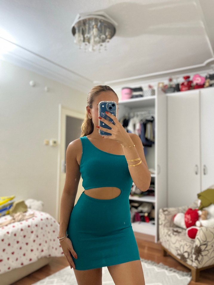Turkuaz renkli , asimetrik yakalı ve belde kesim detayı bulunan, kolsuz, mini boy, vücuda oturan elbise.