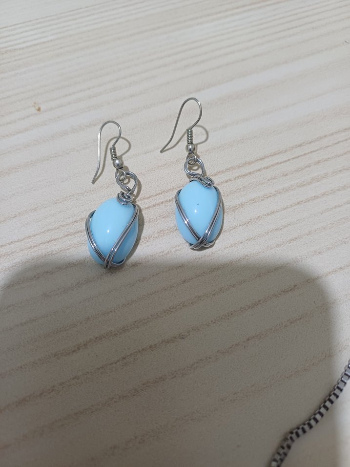 Gümüş tel ile sarılmış turkuaz boncuklu, kısa uzunlukta minimalist bohem tarzda kadın küpeleri. Günlük kullanıma uygundur.