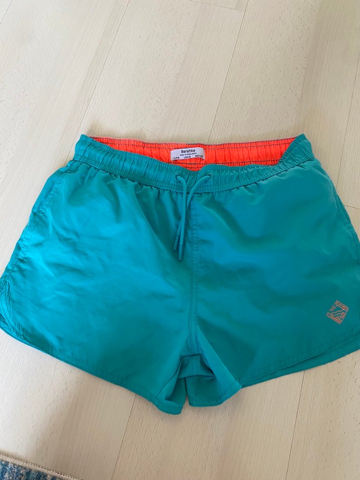 Fıt kesim, turkuaz renkli ve kısa uzunlukta erkek mayo şortu. Parlak turuncu iç astarıyla renkli ve sade tasarım, plaj ve sokak giyimine uygun.