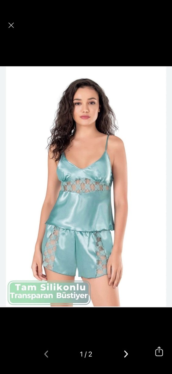 Turkuaz parlak, nakışlı ve transparan bustiyer detaylı, askılı, mini uzunlukta, bol kesim kadın pijama takımı. Rahat ve şık gece kıyafeti.