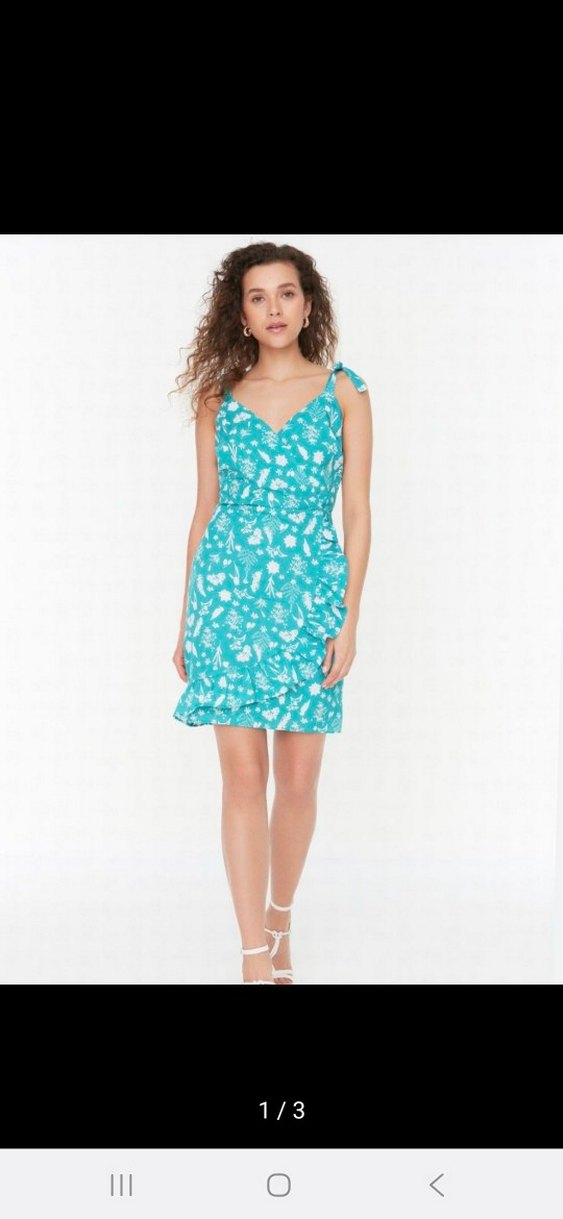 Turkuaz mini elbise, V yaka ve kolsuz tasarıma sahip. Hafif batik desenli ve fırfır detaylı, sentetik kumaştan romantik akşamlar için uygun.