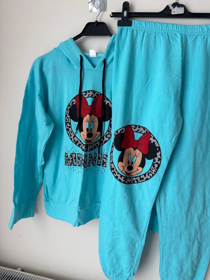 Turkuaz renkli kapüşonlu takımı, sweatshirt ve pantolonda renkli Minnie Mouse baskısı bulunur. Uzun kollu, bol kesim ve düğme detaylı, yumuşak ve rahat kumaştan üretilmiştir.