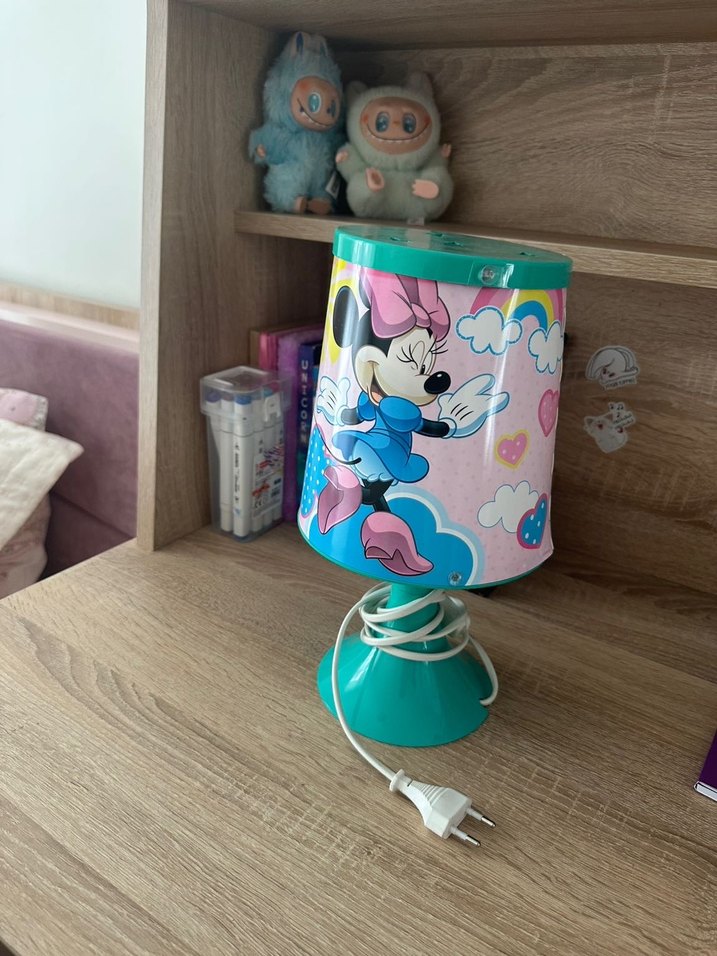 Turkuaz renkte, Minnie Mouse desenli masa lambası. Kullanımı kolay fişli kablo ile birlikte gelir. ️