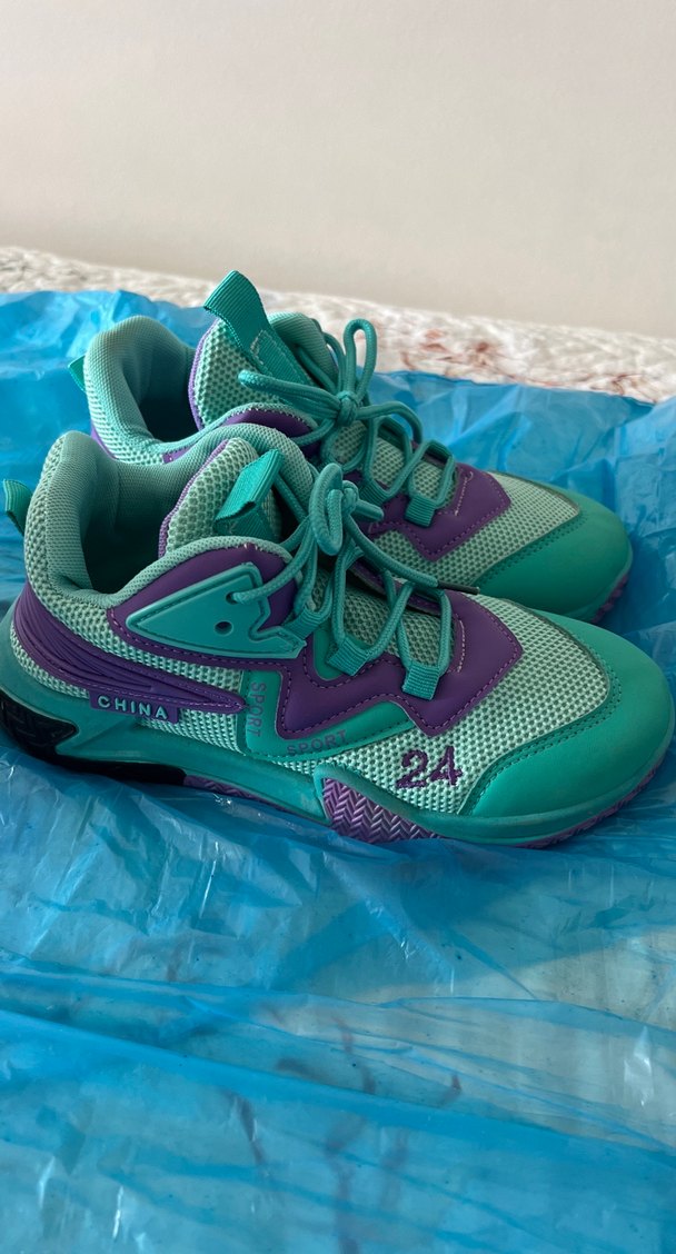 Turkuaz ve mor renklerde, baskılı detaylı ve cırt cırtlı basketbol ayakkabısı. Kauçuk malzemeden, sokak stili ve spor görünüme uygun.
