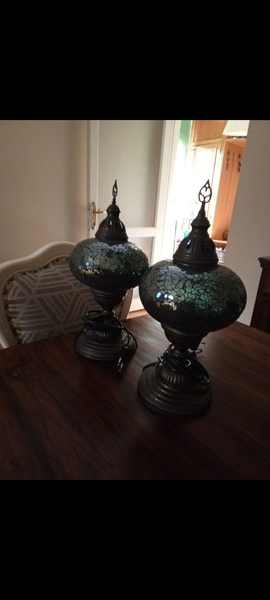 Koyu turkuaz mozaik desenli masa lambaları, dekoratif metal tabanlıdır ve ortam aydınlatması sağlar. Her odaya karakter katar.