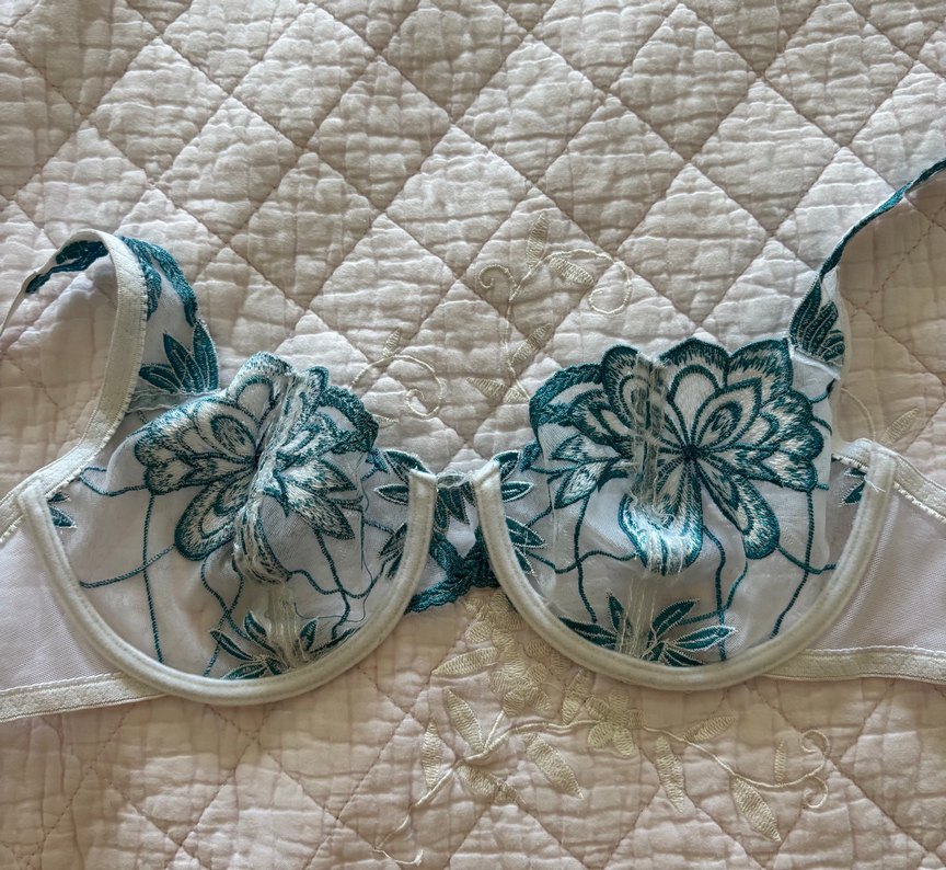Turkuaz renkli, açık tonlarda nakışlı çiçek desenlerine sahip bohem tarzda normal boy bralet. Temiz durumdadır