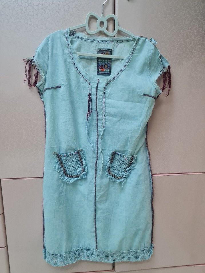 Turkuaz keten kumaştan, V yakalı, nakışlı ve cepli bohem kesim farklı tarz sevenlere midi elbise.%100 pamuk, astarsız giyilmez.Yeni gibi, 2 kez giyildi sadece.