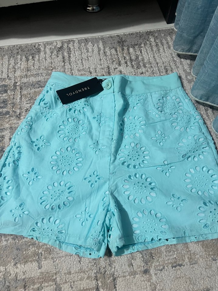 Turkuaz renk, nakışlı dantel detaylı, bol kesim mini şort, yumuşak sentetik kumaştan, içi astarlı cepli