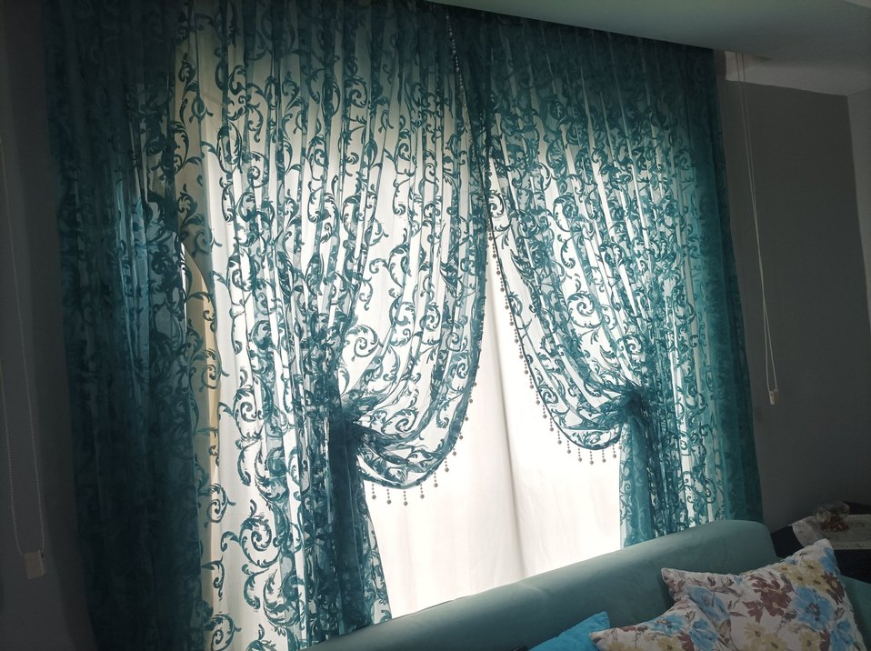Parlak nakışlı bohem desenlere sahip turkuaz tül perde, kenarlarında ince boncuk detayları bulunur. Odaya dekoratif bir dokunuş katar. alalı bir yıl oldu fazla kullanmadım koltuk takımımi değiştirdigim için satıyorum severek aldım yeni gibi ikili fiyatidir biri çift kanatlı 250 en 250 boy diğeri tek kanatlı en 190 boy 250
