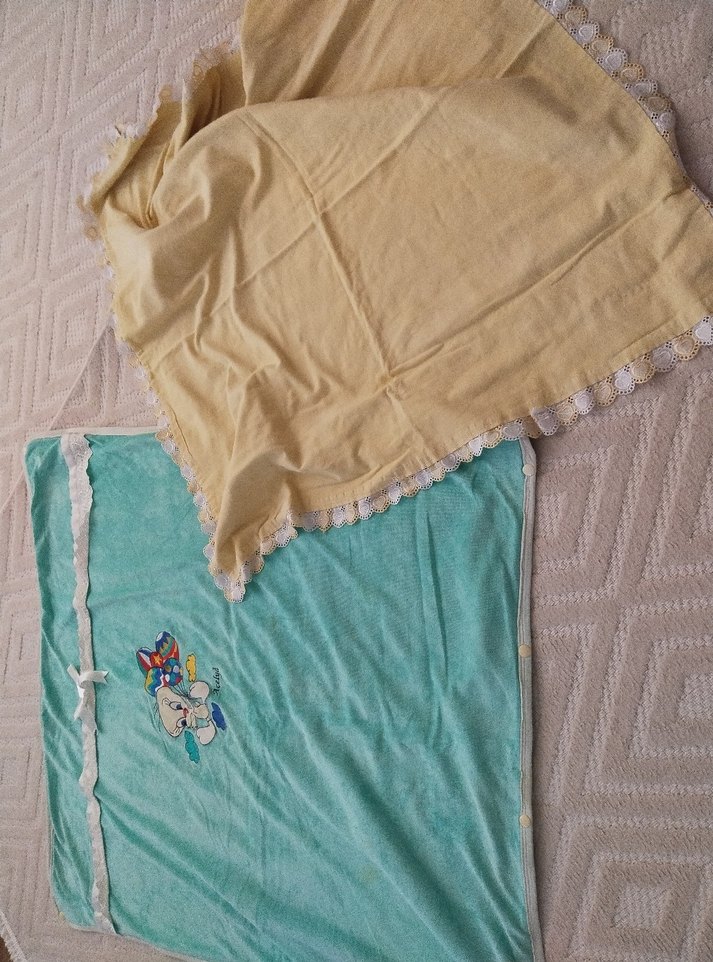 Turkuaz renkli, nakış detaylı ve yumuşak tekstil kumaşından yapılmış çocuk battaniyesi. 2 adet