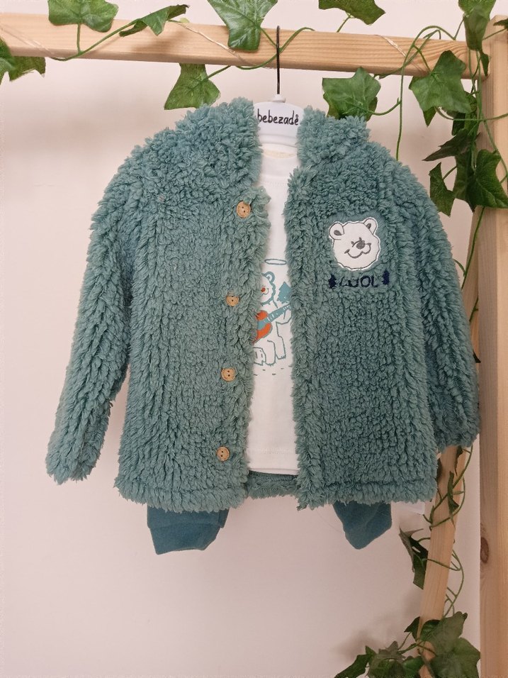 Turkuaz renkte, nakış detaylı, triko ve yumuşak tüylü kumaştan yapılmış, salaş kesim erkek bebek kombini. Notch yakalı ceket ve rahat pantolon içerir.