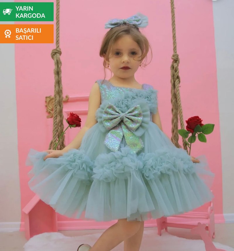 Nakışlı detaylar ve fırfırlarla süslenmiş turkuaz renkli, straplez ve kolsuz, bohem tarzda, beli büyük fiyonk detaylı, yumuşak sentetik kumaştan kız elbisesi.