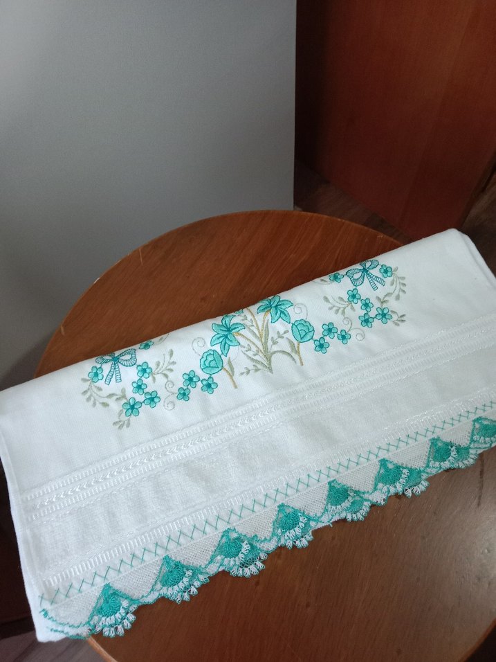 Turkuaz renkli çiçek nakışları ve dantel kenarıyla havlu