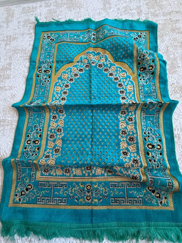 Rengarenk turkuaz seccade nakışlı çiçek ve geometrik desenlerle geleneksel bir tarz sunar.