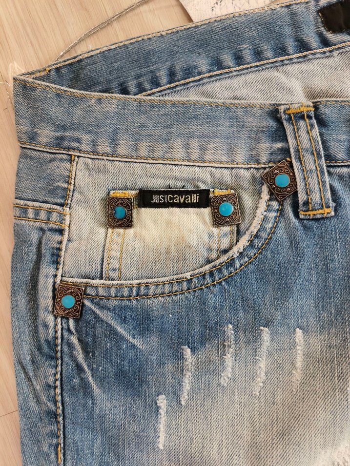 Bol kesim mini kot şort, turkuaz kemer tokaları ve nakış detaylarıyla sokak stiline uygun. Parlak turkuaz öğeler canlılık katıyor. Marka: Just Cavalli. orjinal