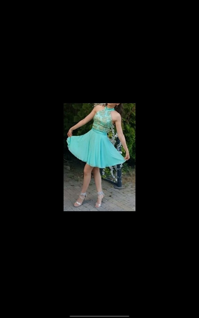 Üründen 6 adet mevcuttur. Toplu alımda indirim yapılacaktır. Bedenler 34-38 arasındadır. Farklı göğüs kalıplarına göre tercih edebilirsiniz. Turkuaz renkli, nakışlı dantelli ve boyundan askılı üst kısmı olan, mini boy abiye elbise, parti ve çok kişili gösteriler için uygun şık bir modeldir. ✨