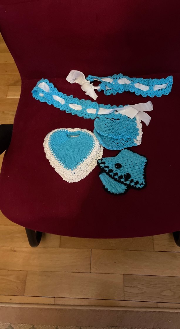 Turkuaz renkte, nakışlı ve kısa kesim hamilelik ile emzirme aksesuarları. Beyaz kurdele detaylı renkli, el yapımı tığ işi parçalar içerir.