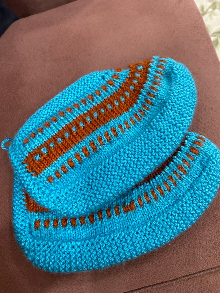 Turkuaz renkli, nakışlı örgü kadın patikleri. Bohem ve retro tarzıyla yumuşak ve rahat bir kullanım sunar.