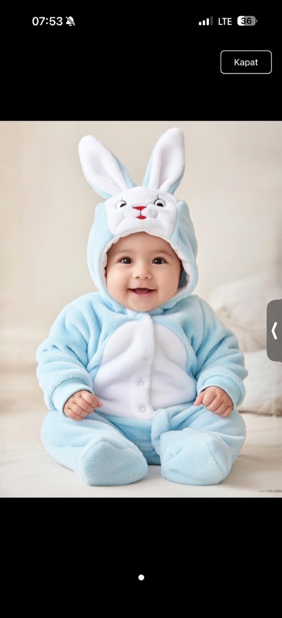 Pastel turkuaz renkte, nakışlı desenlere ve peluş kürk detaylara sahip, sokak stili bebek tulumu. Rahat ve sıcak tutar.