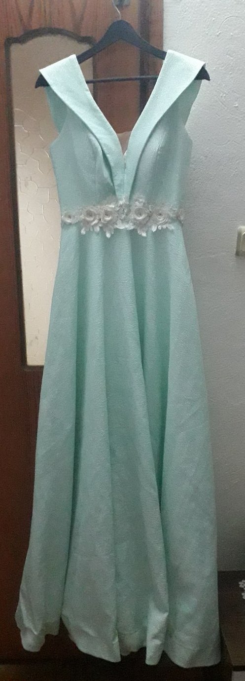 Uzun, askısız ve bol kesim elbise, nakış ve drapeli detaylara sahip. Turkuaz pastel rengiyle vintage ve klasik şıklığı yansıtıyor.