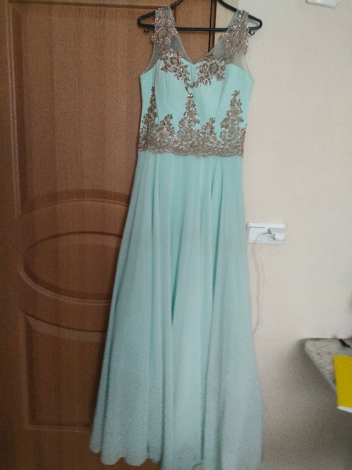 Turkuaz renkli, V yakalı ve kolsuz uzun abiye elbise. Nakış detayları ve drapeli kumaşıyla düğünler için şık ve modern klasik tarzda.1 kez giydim fakat kuru temizleme yapılmadı.