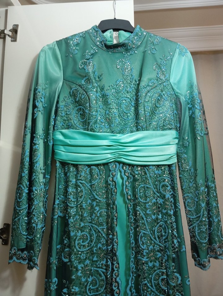 Turkuaz renkli, parlak nakışlı, yüksek yakalı ve uzun kollu, drapeli bel detaylı uzun abiye elbise.
