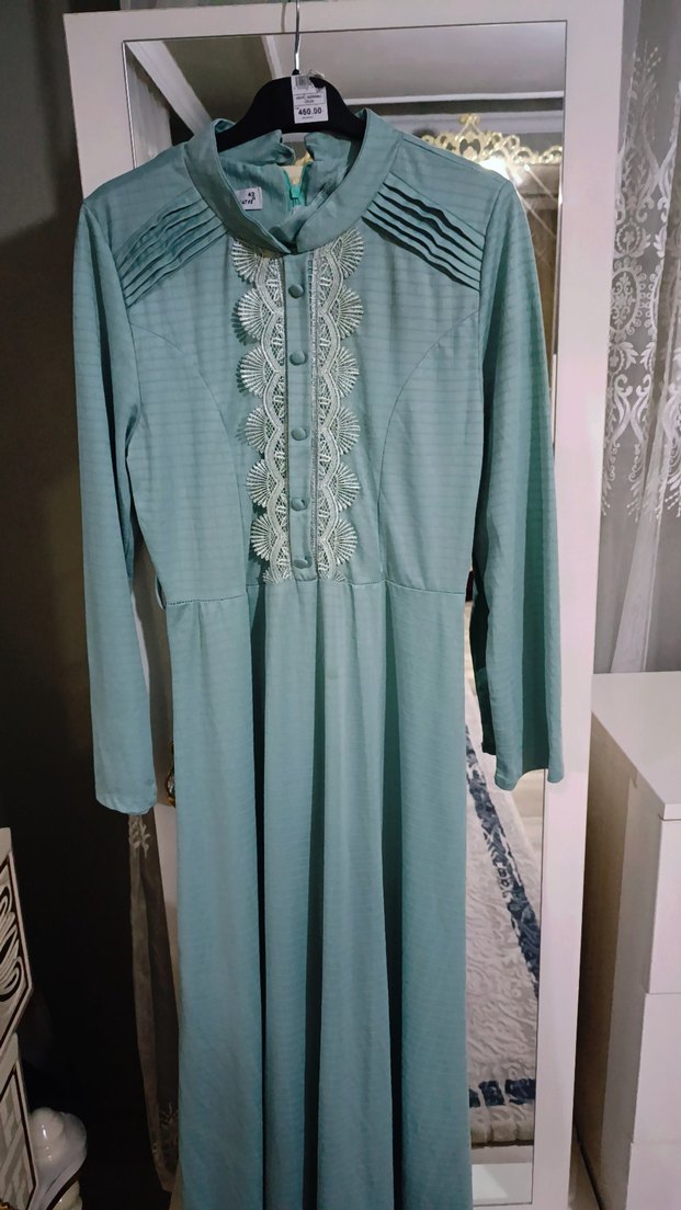 Turkuaz renkte, yüksek yakalı, pile detaylı ve nakışlı uzun kollu uzun elbise. Düz kesim ve sentetik kumaştan, ofis kullanımı için uygundur.