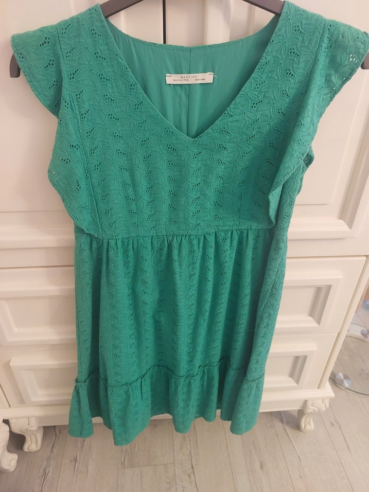 Turkuaz renkli, V yakalı ve nakışlı detaylara sahip bohem tarzda, volanlı kollu midi uzunlukta bol kesim elbise. Yumuşak sentetik kumaştan üretilmiştir.