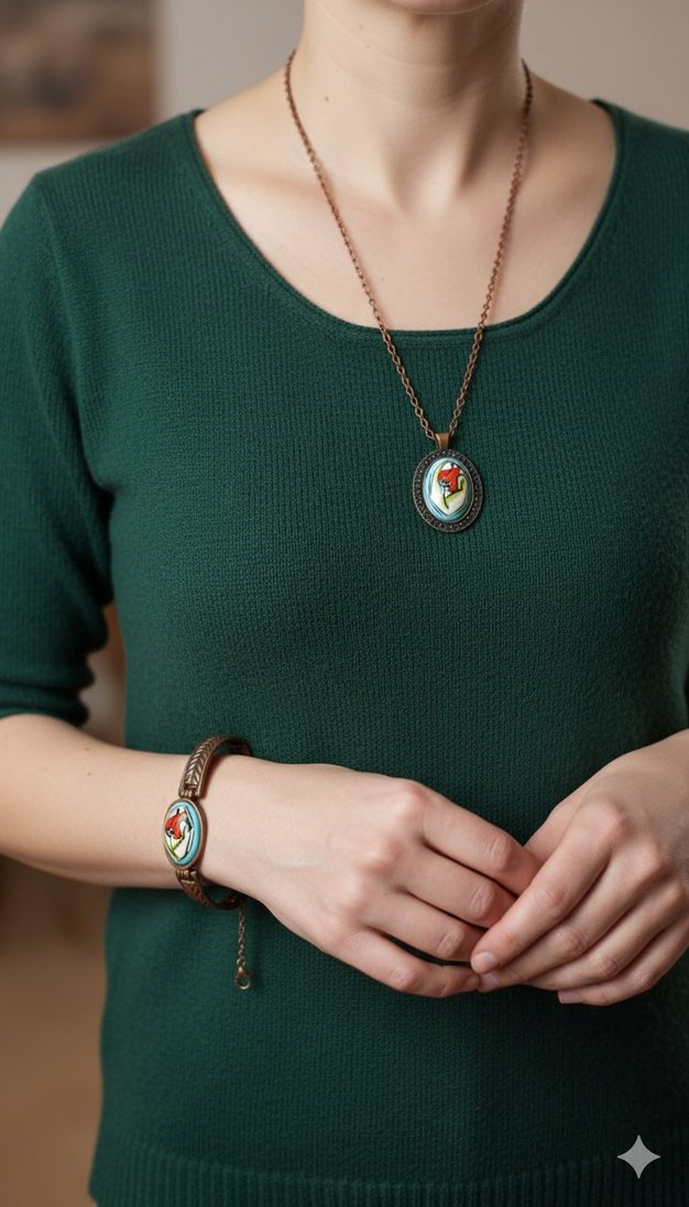 Turkuaz nakışlı figürlü, zincir detaylı bohem takı seti, renkli ve vintage tarzıyla günlük kullanıma uygundur.