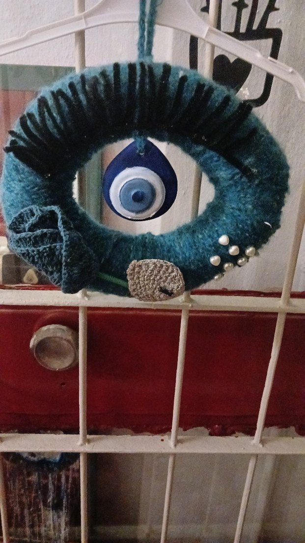 Turkuaz renkli çelenk, ortasında mavi nazar boncuğu, tığ işi çiçekler ve küçük inciler ile süslenmiştir. Geleneksel ve yumuşak dokulu bir dekor.