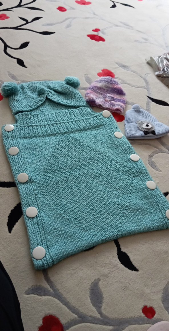 Yanları düğmeli ve ponponlu kapüşonlu turkuaz örgü bebek battaniyesi, bebekleri sıcak tutmak için uygundur. şapkalar toplu alışta hediye edileck