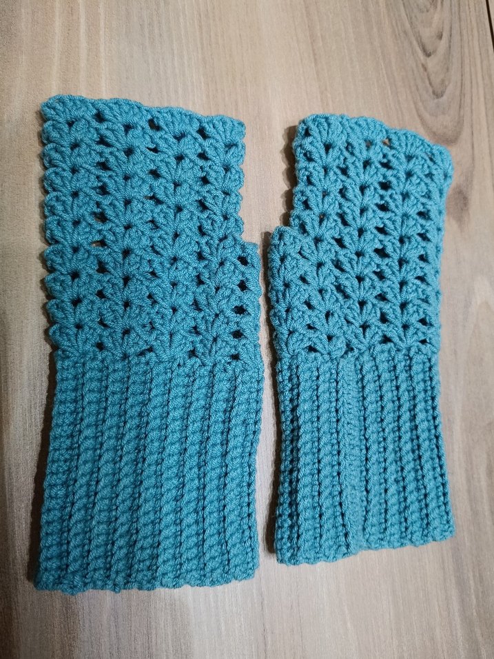 Turkuaz renkli, örgü bohem tarzda kadın eldiveni. Rahat ve renkli yapısıyla retro ve hippie stillerine uygun.