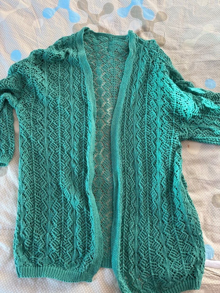 Turkuaz renkli, örgü dokuma, bol kesim, uzun kollu ve bisiklet yaka bohem tarzda midi uzunlukta kadın hırka.