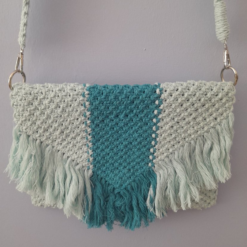 Turkuaz ve su yesili, örgü dokulu, püsküllü kenarlarıyla bohem ve rahat bir makrome çanta