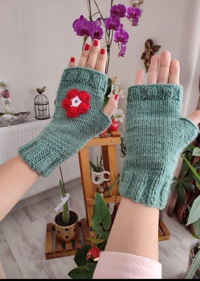 Turkuaz pastel renkli, kırmızı çiçek detaylı örgü parmaksız eldivenler. Rahat ve sıcak dokusu ile bohem tarzı tamamlar.